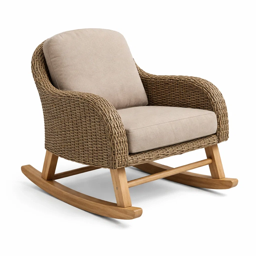 Fauteuil à bascule en rotin et bois avec coussins en polyester