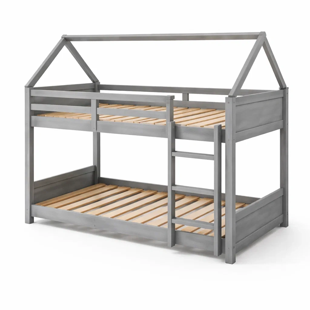 Ce lit superposé pour enfant est fabriqué en bois de pin massif, et dispose d'une échelle et d'un cadre de toit. La finition grise lui confère une apparence moderne.